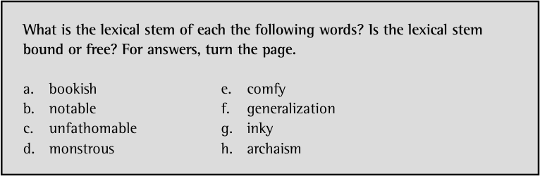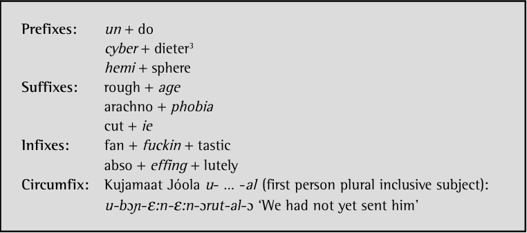 Recall from Morphemes that affixation may involve prefixes, suffixes, infixes, and perhaps circumfixes. Since our primary focus is on English, we deal only with the first two types, although as you can see in the following box, English does have a productive infixing process that incorporates swearwords.