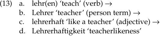 In German, Aronoff and Fuhrhop observe another type of restriction on affixation. The following examples show how affixation can be recursive. In (13a) we have a verbal stem ‘teach’, which can be made into a noun with the addition of -er. This noun, in turn, can be made into an adjective, which can then be turned into a complex noun, Lehrerhaftigkeit ‘teacherlikeness’.