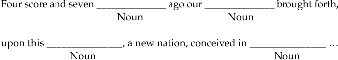 The person eliciting the words for the blanks in the Gettysburg address above automatically knows to put the first noun provided by his or her partner in the plural because “four score and seven” implies more than one (a score is a group of twenty, so “four score and seven” is eighty-seven). There is no need for the mad lib instructions to specify “plural noun.” Similarly, if a person eliciting words for a mad lib says, “Verb,” the reply will probably come in the citation form of the lexeme: READ, SLURP, LOVE, or KISS. But he or she will know whether it is necessary to add an -s, -ed, or -ing when inserting it into the blank, because it will be determined by context. The instructions do not need to specify “third person singular” or “present participle.”