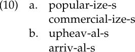 Another generalization that has been made is that derivational affixes tend to occur closer to the root or stem than inflectional affixes. For example, (10) shows that the English third person singular present inflectional suffix -s occurs outside of derivational suffixes like the deadjectival -ize, and the plural ending -s follows derivational affixes, including the deverbal -al: