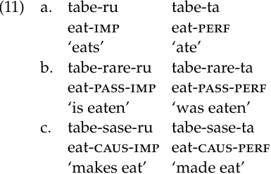 Similarly, Japanese derivational suffixes like passive -rare or causative -sase precede inflectional suffixes marking tense and aspect: