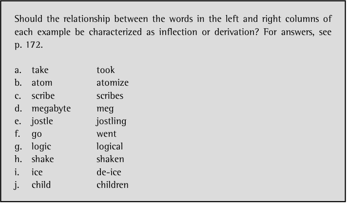 This generalization is largely true, but there are many exceptions in the world’s languages, so it is not a reliable diagnostic for distinguishing between inflection and derivation. (In Morphology and Phonology, we saw that the Kujamaat Jóola derivational suffix -u ‘from’ may follow inflectional suffixes.)