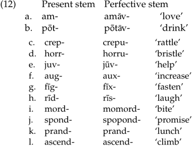 In (12) we have listed a variety of alternation types that present–perfective stems fall into in Latin, but we do not attempt to be fully comprehensive. (12a–b) show the regular way of forming perfective stems from present stems in the so-called first conjugation of Latin (verbs whose infinitive ends in -āre). (12c–d) are examples of verbs that have a perfective stem in -u. In (12e) we see an example of a verb whose stem vowel lengthens in the perfective. Examples (12f–h) have a perfective stem in -s. (What is written x was pronounced [ks].) (12i–j) display reduplication in the perfective stem. Finally, in (12k–l) we see that for some verbs, the present and perfective stems are identical.
