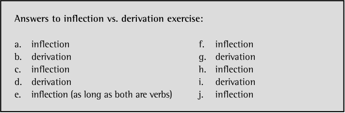 Since our focus in the non-Kujamaat-Jóola portions has been on English, we have had ample opportunity to look at the expression of inflection through affixation. In English, this is the most common means by which inflectional categories are expressed. For that reason we do not address affixation on its own here. Instead we present it with stem alternations, another means of expressing inflection in the world’s languages. We wish to emphasize that just as affixation does not necessarily occur with stem alternations, stem alternations do not necessarily occur with affixation. We present them together merely for organizational purposes.