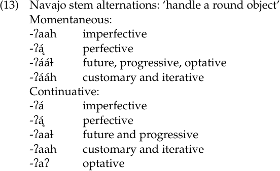 Stem alternations are also a major exponent of inflection in the Apachean languages, a subset of Athapaskan which includes both Navajo and Apache. Active verbs in the Apachean languages are those that describe processes (e.g., ‘become white’) or movements and actions (e.g., ‘walk’, ‘jump’, ‘throw’). They contrast with neuter verbs, which generally express a state of being or position (e.g., ‘be white’, ‘be sit ting’). Active verbs are regularly conjugated in several paradigms: imperfective, perfective, progressive, future, customary, iterative, and optative. The expression of these inflectional categories can generally be described as extended exponence, since it involves both prefixes and, sometimes, a special stem. Some active verbs have two conjugation patterns. The two patterns express aspectual contrasts such as momentaneous vs. continuative, which are distinguished principally through stem alternations. In (13) we provide the stems of the Navajo verb meaning ‘handle a round object’. The first set of stems are those that occur in the momentaneous; the second set are those found in the continuative. (The discussion in this paragraph is paraphrased from Hoijer 1971: 130, and the examples come from there, as well.) In the following examples, vowels with hooks under them are nasalized, and acute accents mark high tone. This is in accordance with Navajo orthography.