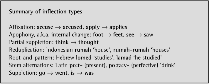 The last type of inflection presented here is suppletion. Suppletion is said to take place when the syntax requires a form of a lexeme that is not morphologically predictable. In English, the paradigm for the verb be is characterized by suppletion. Am, are, is, was, were, and be have completely different phonological shapes, and they are not predictable on the basis of the paradigms of other English verbs. We also find suppletion with pronouns. Compare I and me or she and her. Suppletion is most likely to be found in the paradigms of high-frequency words, as seen in the following box.