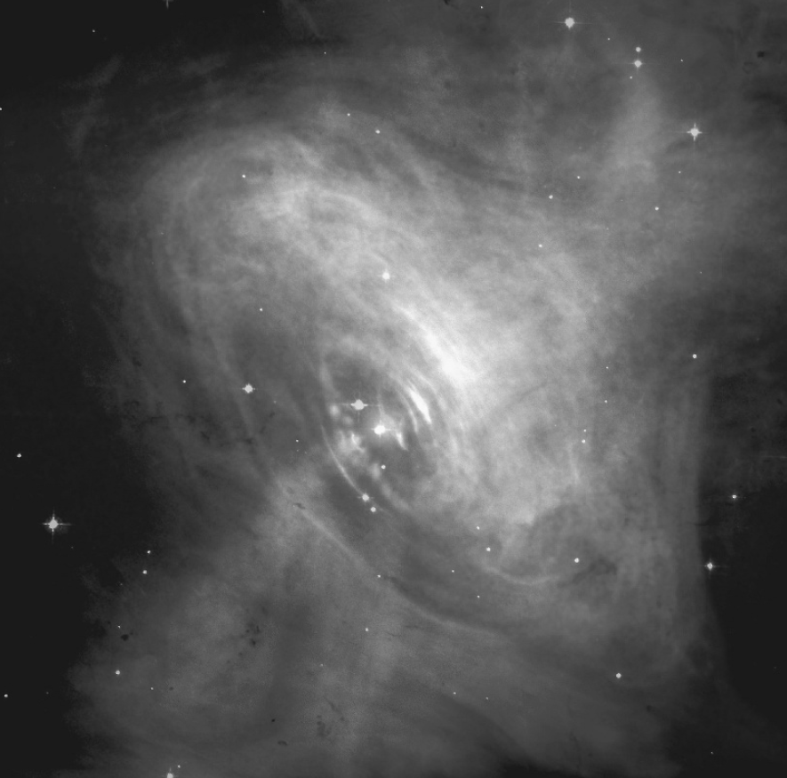 The bright object at the center of the Crab Nebula is the pulsar discovered in 1968. Such objects are actually neutron stars.