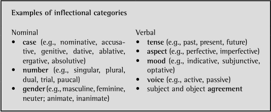 If you look at many languages, you will discover that certain types of inflectional categories appear over and over again. For example, nouns are regularly inflected for case, number, and gender. Nouns in different languages do not necessarily inflect for the same cases – some languages will have two and others 20; nor do they inflect for the same genders. For verbs, the picture is similarly limited. Verbs might inflect for tense, aspect, mood, voice, or agreement, but you generally do not find languages where verbs inflect for other categories. Our brief overview of the German and Ojibwa gender systems, along with our more detailed treatment of the gender system of Kujamaat Jóola, should illustrate that although the inflectional categories themselves may not be universal, universal principles govern what is inflectionally possible and what is not.