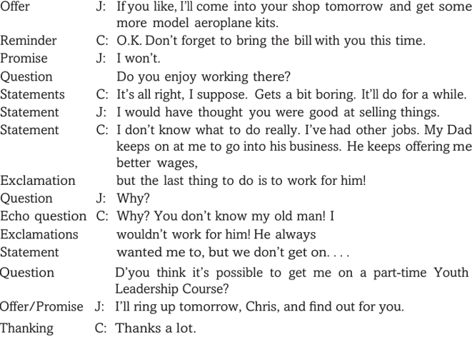 Let us start from the basic concept that language is for communication. Here is part of a recorded conversation taken from a sociological project of the University of Bristol. The speakers are Janice, a girl who runs a youth club and disco in an English town, and Chris, one of the boys in the club, who is 19 and works in a shop. In the dialogue, we can distinguish various types of communicative act, or speech act, by which people communicate with each other: making statements, asking questions, giving directives with the aim of getting the hearer to carry out some action, making an offer or promise, thanking or expressing an exclamation.