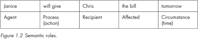 The representational meaning of the clause is encoded through the transitivity structures, whose elements of structure or functions include: Agent, Recipient, Affected, Process, Attribute and Circumstance, as described in “Conceptualizing patterns of experience: processes, participants, circumstances”. Some of these make up the semantic structure of the following example: