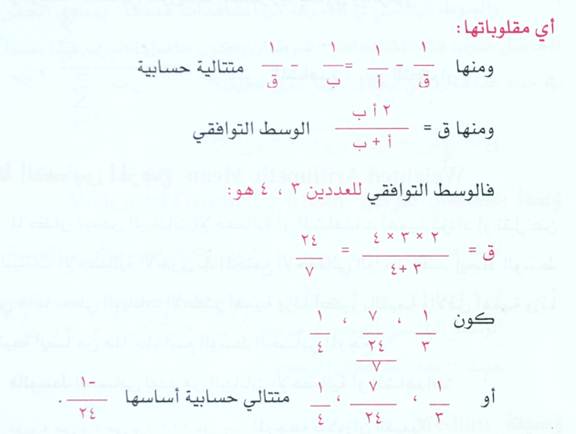 الوسط التوافقي للعددين أ ، ب هو العدد ق الذي يجعل الأعداد أ ، ق ، ب متتالية توافقية .