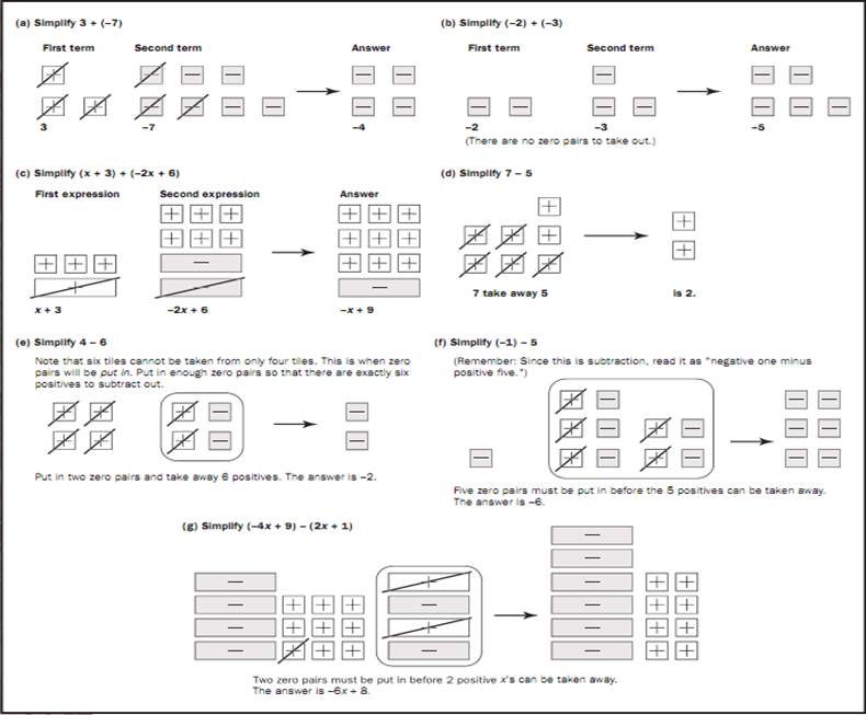 Addition and subtraction are opposites. Whereas the strategy for addition is to remove zero pairs, the strategy for subtraction is to insert zero pairs. To subtract, start by drawing tiles for the first term, and then take away the amount to be subtracted, as shown in examples (d) through (g) of Figure 2.