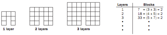 By studying the blocks and the table of relationships between layers and blocks, a pattern can be seen. For one layer, the tunnel requires enough blocks to make a 3 x 3 square less two blocks. For two layers, it requires enough blocks to make a 4x 5 rectangle less two blocks. For three layers, it requires enough blocks to make a 5 x 7 rectangle less two blocks.