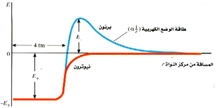 وبالنسبة لنواة ما فإن كل بروتون وكل نيوترون يكون مربوطاً داخل النواة بنفس طاقة الربط وهي –E0. (ما سبب كون طاقة الربط ذات إشارة سالبة؟). ويلخص الشكل (1) شكل طاقات البروتون والنيوترون عند مسافات مختلفة من النواة (طاقات كتلة السكون المنفردة ليست مذكورة) ونستنتج من هذا أن:
