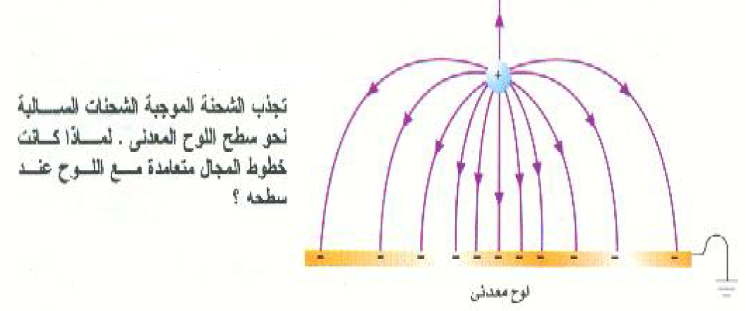الإلكترونات حرة في أن تتحرك خلال مادة ما موصلة استجابة للقوة الكهربية. افترض ان كرة صغيرة موجبة الشحنة موجودة فوق لوح معدني كبير كما في الشكل ((1. ستنجذب إلكترونات اللوح المعدني بواسطة الشحنة الموجبة. . وعلى الرغم من عدم تمكنها من مغادرة اللوح إلا أنها ستميل إلى الحركة تحو الشحنة الموجبة ولذا فغنه تتجمع عند سطح اللوح أقرب ما يكون من الكرة. ولو ان اللوح موصل بالأرض، فإن الشحنة السالبة ستسري من الأرض إلى داخل اللوح لتحل محل الإلكترونات التي دفعت إلى الحركة لتصبح اقرب ما يمكن من الكرة المشحونة. ولكن اللوح وهو في الاصل متعادل، سيكتسب الآن شحنة سالبة صافية مساوية عدداً للشحنة الموجبة مما ينتج عنه نمط المجال الكهربي المبين في الشكل ((1.