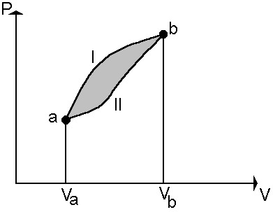 لنفرض أنَّ نظاماً PVT ينتقل من حالة اتزان ابتدائية a إلى حالة اتزان نهائية b كما في الشكل 5-3. يختلف الضغط بيْنَ المسار I والمسار II وهذا يعني أنَّ الشغل، المساحة المحصورة تحت المنحنى والمعرّفة بالمسار I والمسار II على التوالي، يختلف في المساريْن حتماً، وتُمثِّل المساحة المُظلّلة (وهي الفرق بيْنَ المساحتيْن السابقتيْن) الفرق بيْنَ الشغليْن.