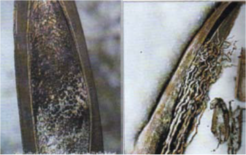 الأعراض: وجود ثقوب وأخاديد غير منتظمة الشكل- أنفاق وأخاديد على أجزاء الورقة والنورة الثمرية مع عدم وجود براز وخيوط حريرية- تغذية سطحية وأخاديد على أجزاء الورقة والنورة الثمرية.