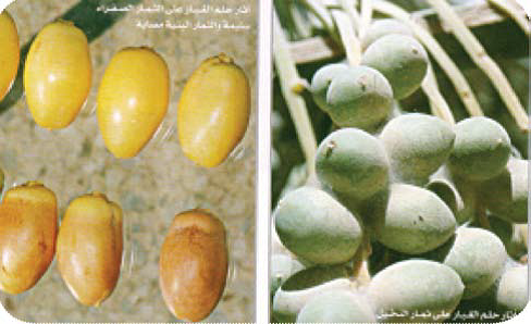 الأعراض: وجود شبكة من الخيوط الحريرية متراكم عليها غبار يغطى الثمار والعذوق عند مرحلة الخلال والرطب.
