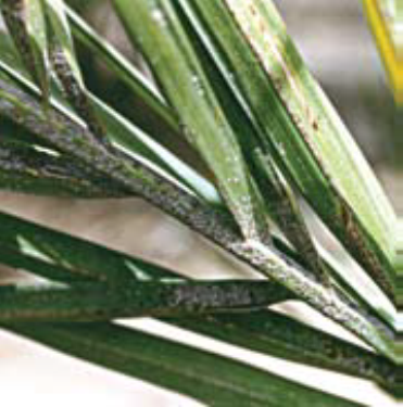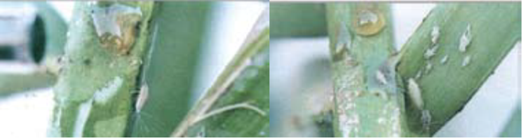 الأعراض: وجود بثرات ذات لون أبيض مسمر مستديرة وبيضاوية على أجزاء الورقة والنورة الثمرية, مواد دبسية وتغذية على أجزاء الورقة والنورة الثمرية المختلفة.