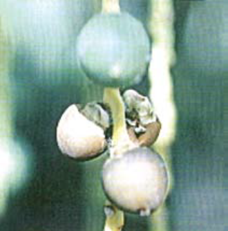 الأعراض: تبقع الحافة الجانبية لساق السعفة ويكون التبقع غير منتظم لونها أسمر ضارباً للسواد. ويكون السعف مشوهاً- اسوداد الطلع وتعفنه- اسوداد البرعمة أو الجمارة- تعفن الجمارة, وظهور برعمة جانبية.