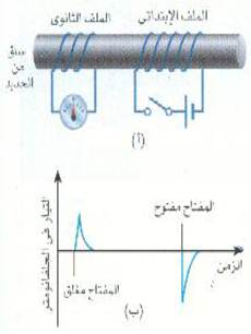 تستخدم في هذه التجربة معدات بسيطة كالمبينة في الشكل ( 1أ) ، حيث نرى دائرتين بسطتين ، والتوصيل في كل منهما على التوالي. تتكون الأولى من بطارية ومفتاح تتصل معاً على التوالي بواسطة سلك طويل ملفوف حول قضيب من الحديد المطاوع. ويطلق على هذا الملف ملفاً ابتدائياً لأن يتصل بالبطارية. اما الثانية فيلتف بها سلك مستقل حول القضيب نفسه ويتصل على التوالي بجلفانومتر ولكنها لا تحتوي على أية بطارية وهذا الملف هو ما يسمى بالملف الثانوي.
