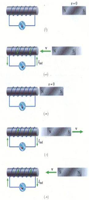 اما الشكل (2) فيوضح تجربة ثانية تشبه الأولى إلى حد ما ، حيث تحتوي الدائرة على قضيب مغناطيسي وملف متصل على التوالي مع جلفانومتر وعندما يستقر المغناطيس ساكناً إلى جوار الملف كما في (أ) و (جـ) فلن يكون هناك تيار في الملف. أما إذا تحرك المغناطيس بالنسبة للملف فإن تياراً يسري في الملف كما هو مبين في الاجزاء (ب) ، (د) ، (هـ) ، وكما نرى فإن قوة دافعة كهربية مستحثة تظهر في الملف عندما يكون الملف والمغناطيس في حركة نسبية إزاء بعضها البعض فقط. لا تتواجد قوة دافعة كهربية مستحثة إذا لم تكن هناك ظروف متغيرة.