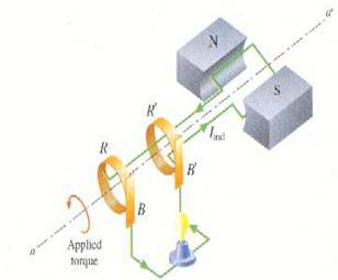 الشكل ((1 : عندما تدور العروة في مجال مغناطيسي فإن ق. د. ك متردد تولد بين الطرفين B و B'.