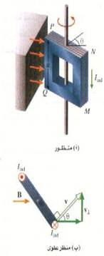 وسندرك عند استعمال قاعدة اليد اليمنى بالنسبة لانحراف الشحنات الموجبة المتحركة أن اتجاه التيار المستحث يكون من N إلى M في الضلع MN ومن Q إلى p في الضلع PQ. ومن ثم فإن ق. د. ك مستحثة مماثلة في PQ سوف تتراكم مع ق. د. ك المستحثة في MN . يلاحظ ان الضلعين PN و MQ لا يقطعان خطوط المجال عند دوران الملف؛ ولهذا لن تستحدث ق. د. ك في هذين الضلعين.