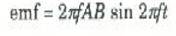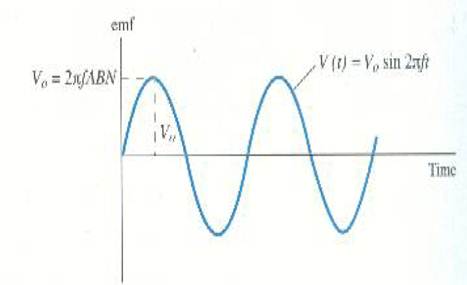 وكما هو واضح، فإن ق. د. ك المستحثة في ملف دوار تتغير كدالة جيبية مع الزمن كما يبين ذلك الشكل ((3 ، حيث تصل ق. د. ك المستحثة ( او الفولطية) إلى قيمتها القصوى عندما يكون sin 2πf t = 1 ، وعندئذ تصبح قيمتها العظمى هي .2πfABN من المنطقي إذن أن الفولطية القصوى تكون كبيرة عند قيم f الكبيرة (أي أن الفيض يتغير بسرعة) ، وعند قيم A و B الكبيرة ( أي عندما يكون الفيض نفسه كبيراً) ، عندما يكون عدد اللفات بالملف كبيراً.