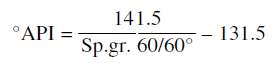 Density is defined as the mass of unit volume of a material at a specific temperature. A more useful unit used by the petroleum industry isspecific gravity, which is the ratio of the weight of a given volume of a material to the weight of the same volume of water measured at the same temperature. Specific gravity is used to calculate the mass of crude oils and its products. Usually, crude oils and their liquid products are first measured on a volume basis, then changed to the corresponding masses using the specific gravity. The API (American Petroleum Institute) gravity is another way to express the relative masses of crude oils. The API gravity could be calculated mathematically using the following equation: