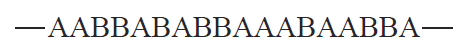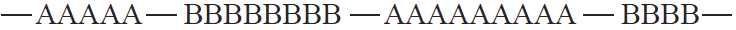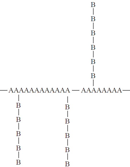 • Random copolymer — The repeating units are arranged randomly on the chain molecule. It we represent the repeating units by A and B, then the random copolymer might have the structure shown below: