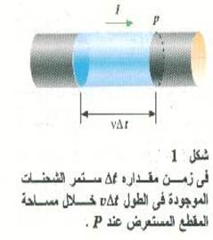 ولكننا لا زلنا بحاحة للتعبير عن التيار بدلالة الشحنات المنفردة التي تكونه. وناقل الشحنة يتحرك مسافة معينة في اتجاه التيار في زمن مقدارهt Δ ، فإذا كان متوسط سرعة الناقل هو v ، فإن المسافة التي يتحركها في زمن مقداره tΔ هو vΔt وعلى هذا ، ففي فترة زمنية مقدارهاt Δ ، تكون كل ناقلات الشحنة في طول مقداره vΔt إلى اليسار من النقطة P في الشكل ((1 متحركة خلال المقطع المستعرض عند P. وحيث أن حجم هذا المقطع من الطول هو AVΔt ، ولأن لديناnu من ناقلات الشحنة في وحدة الحجوم ، يكون عدد ناقلات الشحنة التي تعبر P في زمن مقداره Δt هوnu Av Δt وكل ناقل يحمل شحنة مقدارها q ولهذا: