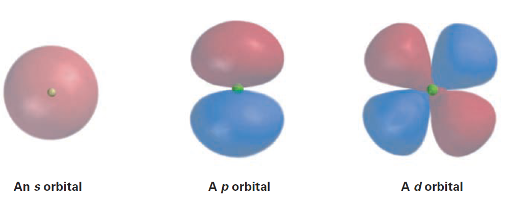 What do orbitals look like? There are four different kinds of orbitals, denoted s, p, d, and f, each with a different shape. Of the four, we’ll be concerned primarily with s and p orbitals because these are the most common in organic and biological chemistry. An s orbital is spherical, with the nucleus at its center; a p orbital is dumbbell-shaped; and four of the five d orbitals are cloverleaf-shaped, as shown in Figure 1. The fifth d orbital is shaped like an elongated dumbbell with a doughnut around its middle. The orbitals in an atom are organized into different electron shells, centered around the nucleus and having successively larger size and energy. Different shells contain different numbers and kinds of orbitals, and each orbital within a shell can be occupied by two electrons.