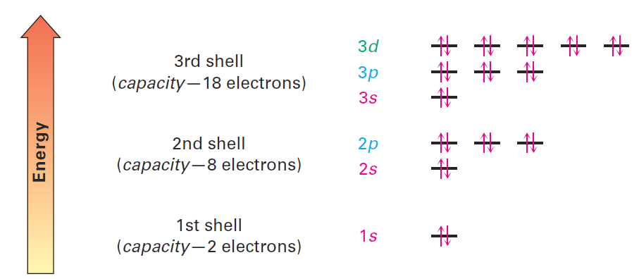 The first shell contains only a single s orbital, denoted 1s, and thus holds only 2 electrons. The second shell contains one 2s orbital and three 2p orbitals and thus holds a total of 8 electrons. The third shell contains a 3s orbital, three 3p orbitals, and five 3d orbitals, for a total capacity of 18 electrons. These orbital groupings and their energy levels are shown in Figure 2.