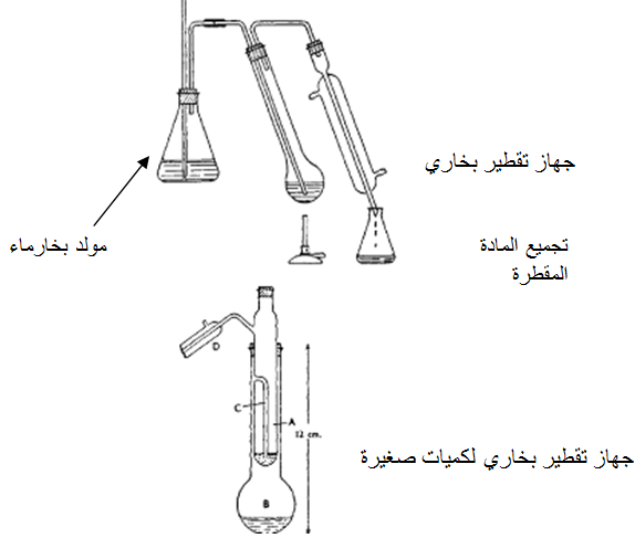 دورق سعته 2 لتر- مولد البخار به ثقبان يدخل في أحدهما أنبوبة أمان وفي الأخرى أنبوبة توصيل إلى دورق دائري توضع فيه المادة المراد تنقيتها- أنابيب توصيل – مكثف- قابلة- ماء.