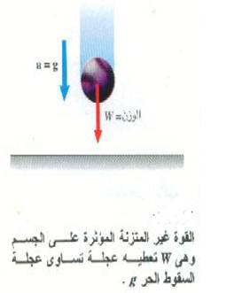 من الضروري جداً أن نعي أن كتلة الجسم ووزنه ، بالرغم من ارتباطهما أحدها بالآخر ، هما خاصيتان فيزيائيتان مختلفتان تماماً. فالوزن قوة بينهما الكتلة أحد الأبعاد الأساسية. هناك تجربة بسيطة للتعرف على العلاقة بين الكتلة والوزن. عندما تكون القوة الوحيدة المؤثرة على جسم ما هي وزنه ( أي قوة الجاذبية المؤثرة عليه) يتحرك الجسم بعجلة السقوط الحر g ( شكل 1). فإذا رمزنا للوزن بالرمز W يمكن كتابة قانون نيوتن الثاني في حالة السقوط الحر لجسم على الصورة: