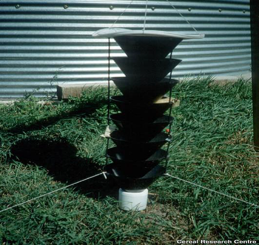مجموعة من الاقماع البلاستيكية (4 أو اكثر) ويوضع عليها حماية من الاعلى من المطر وفي اسفلها يوضع ماء به قليل من مسحوق الغسيل توضع خارج الابنية والصوامع لجمع الحشرات.