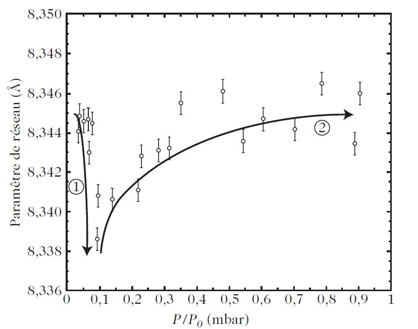 Fig.1. Dependence of the lattice parameter for a nanometric γ-Fe2O3 powder on the state of adsorption of water vapour on the powder. For water vapour pressures below a critical value (around P/P0 = 0.1), the formation of a monolayer appears to compress the oxide, whilst for high pressures, the formation of multilayers of water would appear to relax the oxide by strengthening the bonds between water layers [32]. (1) 630 kJ/mol: chemisorption of OH2− and physisorption of H2O (monolayer on γ-Fe2O3). (2) 45 kJ/mol: physisorption of H2O (multilayer on H2O)
