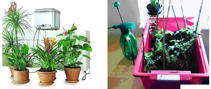 2- تباع في الاسواق احواض نباتية ذاتية الري تتكون من مستويين المستوى العلوي (يشغل ثلثي عمق الحوض ويوضع به النبات بالتربة الخاصة به) والمستوى السفلي (ويكون القاع الاسفل للحوض من الداخل ومفصول بحاجز عن المستوى العلوي) ويمر بين المستويين انبوب طويلة افقية كلها ثقوب جانبية راسية بصعود المياه في الانبوب من حزان المياه الى التربة العلوية بالخاصية الشعرية من خلال ثقوب الانبوبة. كما توجد اشكال اخرى لأنظمة الري الذاتي التي تعتمد على تايمر يعمل بالكهرباء ويوصل بنقاطات او رشاشات لري النباتات.