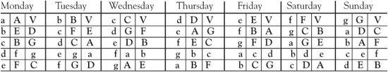 The essence of combinatorics is captured by a master of the subject, Rev. Thomas Kirkman, working at a time when combinatorics was mostly linked to recreational mathematics. He made many original contributions to discrete geometry, group theory and combinatorics but never had a university appointment. The conundrum which reinforced his reputation as a nononsense mathematician was the one for which he will always be known. In 1850 Kirkman introduced the ‘15 schoolgirls problem’, in which schoolgirls walk to church in 5 rows of 3 on each day of the week. If you are bored with Sudoku you might try to solve it. We need to organize a daily schedule so that no two walk together more than once. Using lower case and upper case deliberately, the girls are: abigail, beatrice, constance, dorothy, emma, frances, grace, Agnes, Bernice, Charlotte, Danielle, Edith, Florence, Gwendolyn and Victoria, labelled a, b, c, d, e, f, g, A, B, C, D, E, F, G and V, respectively.