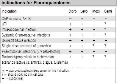 Many of the fluoroquinolones are near-ideal antibiotics: they have broad-spectrum activity that includes Gram-positive, Gram-negative, and atypical organisms; display excellent oral bioavailability; and have a relatively low incidence of adverse effects. Unfortunately, these characteristics have led to overprescribing and the inevitable rise in resistance, despite recommendations to reserve this class. In particular, although activity against enteric Gram-negative organisms (such as E. coli and Klebsiella) has historically been excellent, in certain geographical regions or patient populations these drugs have lost much of their potency. The newer drugs (moxifloxacin, gemifloxacin) gain in-creasing Gram-positive (mostly pneumococcal) activity at the expense of some Gram-negative (mostly Pseudomonas) activity. Significant differences among the agents are in bold.