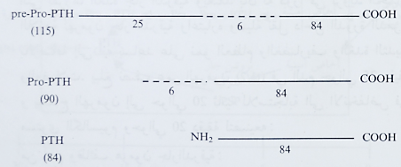 1- يتم تخليق هرمون جار الدرقية من المركب (Pre – Pro – PTH) شكل (1) وهو مركب يحتوي على 115 حامض أميني مرتبطة بقطعة أمينية أخرى تحتوي على 25 حامض أميني يعتقد أنها تقوم بتسهيل دخول المركب إلى داخل تجويف الشبكة الاندوبلازمية الخشنة بعد تصنيعها.
