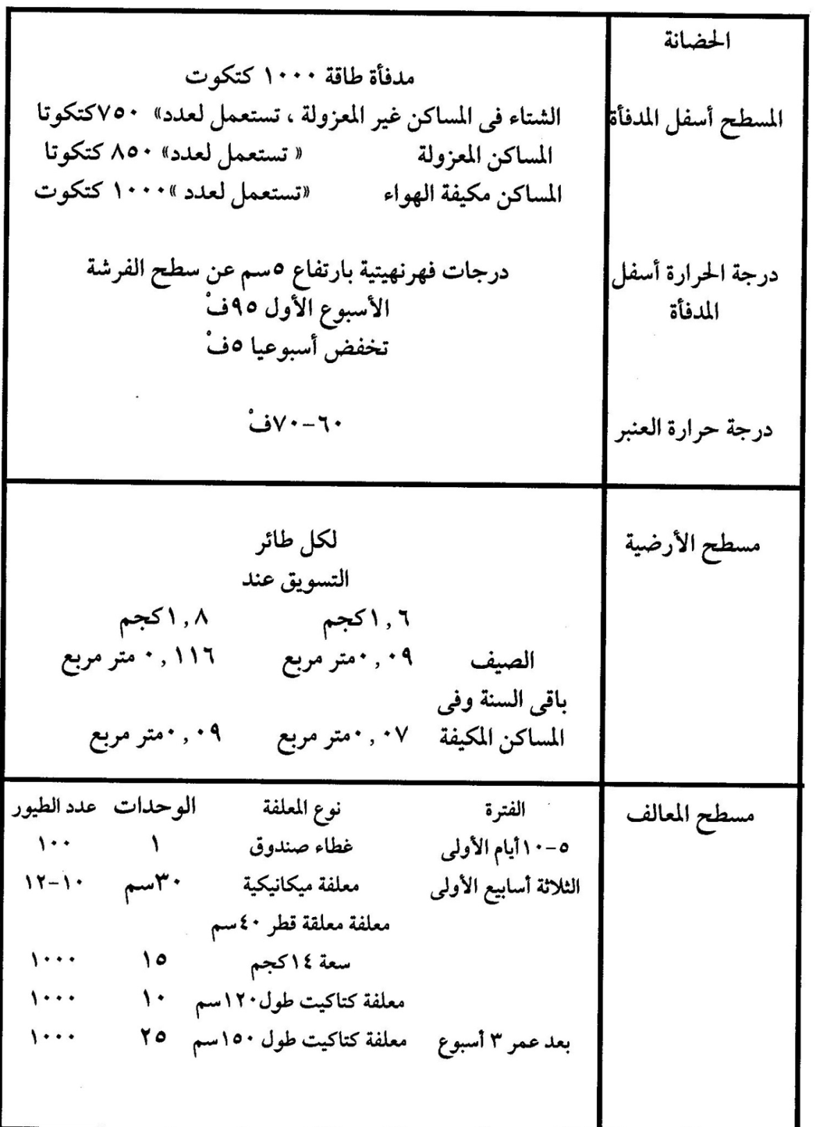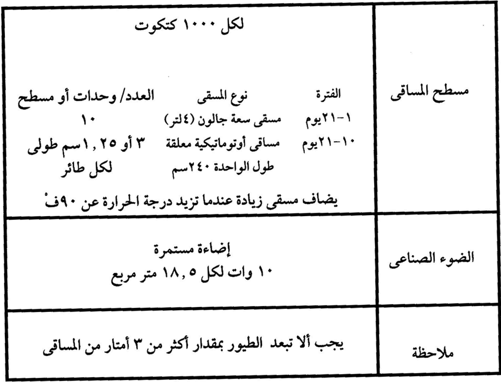0.05م2 400-500 طائر للحضانة مساحة 1×1.3م يستعمل حاجز للكتاكيت ارتفاع 12 متر ويبعد عن حافة المدفاة 1.5م.
