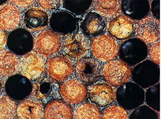 مقطع عامودي في العين السداسية يظهر الحضنة الميتة مستلقية في العين السداسية وقد تحولت إلى قشور.