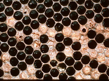 غطاء الحضنة مقعر نسبيا ومثقب وذات رائحة عفنة أشبه برائحة السمك الفاسد مع تغيير لون غطاء الحضنة إلى اللون الغامق.