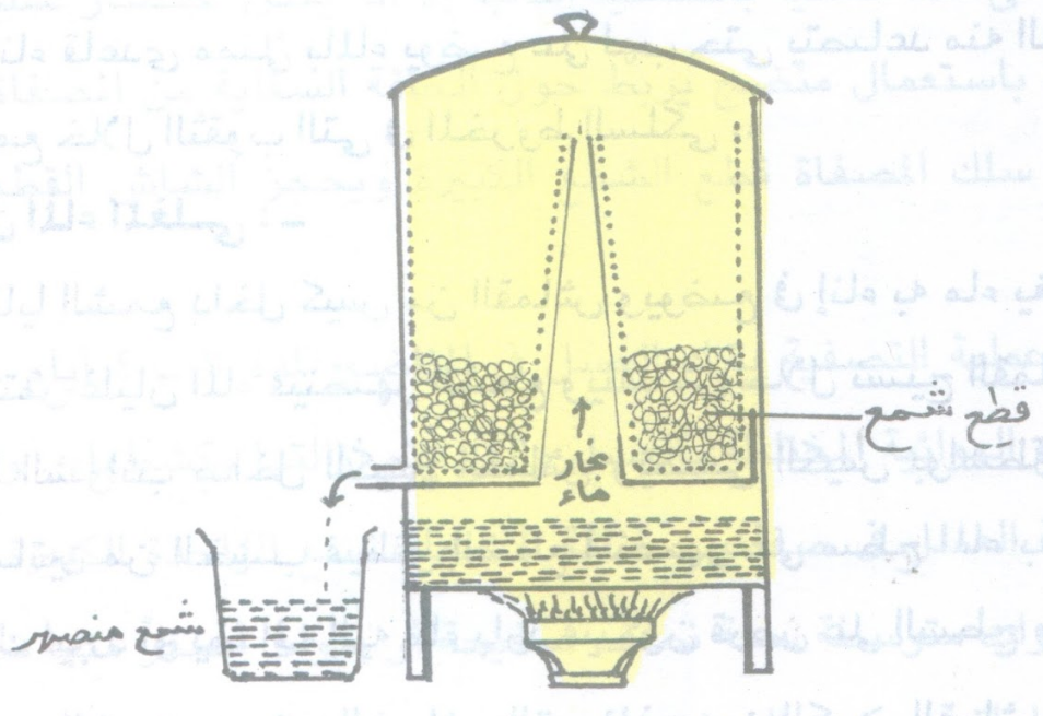 - قفص شبكي بواسطة مخروط متسع من أسفل وضيق من أعلى يركب داخل الوعاء السابق بحيث تترك مسافة بين جدار الوعاء والقفص ثم يوضع بالقفص الشمع المراد فرزه.
