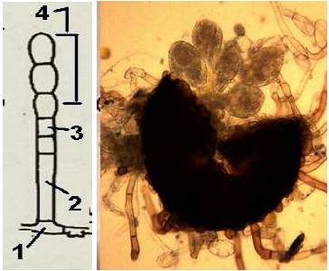 شكل يوضح: مسبب البياض الدقيقي في القرعيات (1) الخلية القاعدية للحامل الكونيدي (2) الحامل الكونيدي (3) الخلية الامية المولدة للجراثيم الكونيدية (4) سلسلة من الكونيديات.