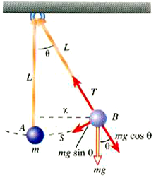 الشكل (1): البندول البسيط. قوة الاستعادة هي mg sin θ = mg θ. لاحظ أن θ = s/L حيث s طول القوس بين النقطتين A و B.