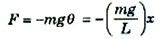 حيث تبين الإشارة السالبة أن القوة في عكس اتجاه زيادة θ. ولكن في حالة الزوايا الصغيرة يمكننا استخدام حقيقة أن sin θ ≈ θ ، حيث θ مقدرة بالزوايا نصف القطرية. (هذا التقريب يكون مضبوطا الى ثلاثة أرقام معنوية إذا كانت ≤ 10oθ، اي 0.174 rad ) ومن تعريف القياس نصف القطر للزوايا يمكننا أيضا كتابة = s/L = x/Lθ. ومن ثم سوف تأخذ قوة الاستعادة الصورة: