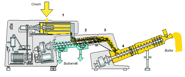 * قسم الفصل في آلة فريتز (Separating section) وهو عبارة عن أسطوانة دوارة تدور بسرعة ٣٥-٤٢ دورة في الدقيقة، حيث يندفع إليها لبن الخض سابحا فيه حبات الزبد صغيرة الحجم لينفصل لبن الخض وينفذ للخارج وتتجمع حبات الزبد وتتكتل لتزداد في الحجم مكونة كريات الزبد وتسمى هذه العملية التكتل الثاني.